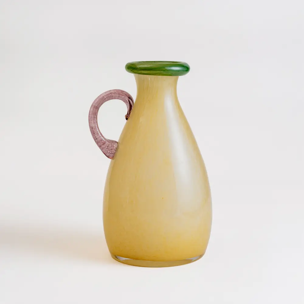 Matcha Vanille, de la collection Douceur Pastel, est un petit vase soufflé à la main qui marie parfaitement douceur et élégance. Son corps beige vanillé est surmonté d’un col vert tendre matcha et d’une anse mauve en verre lustré, créant une harmonie visuelle délicate et raffinée.